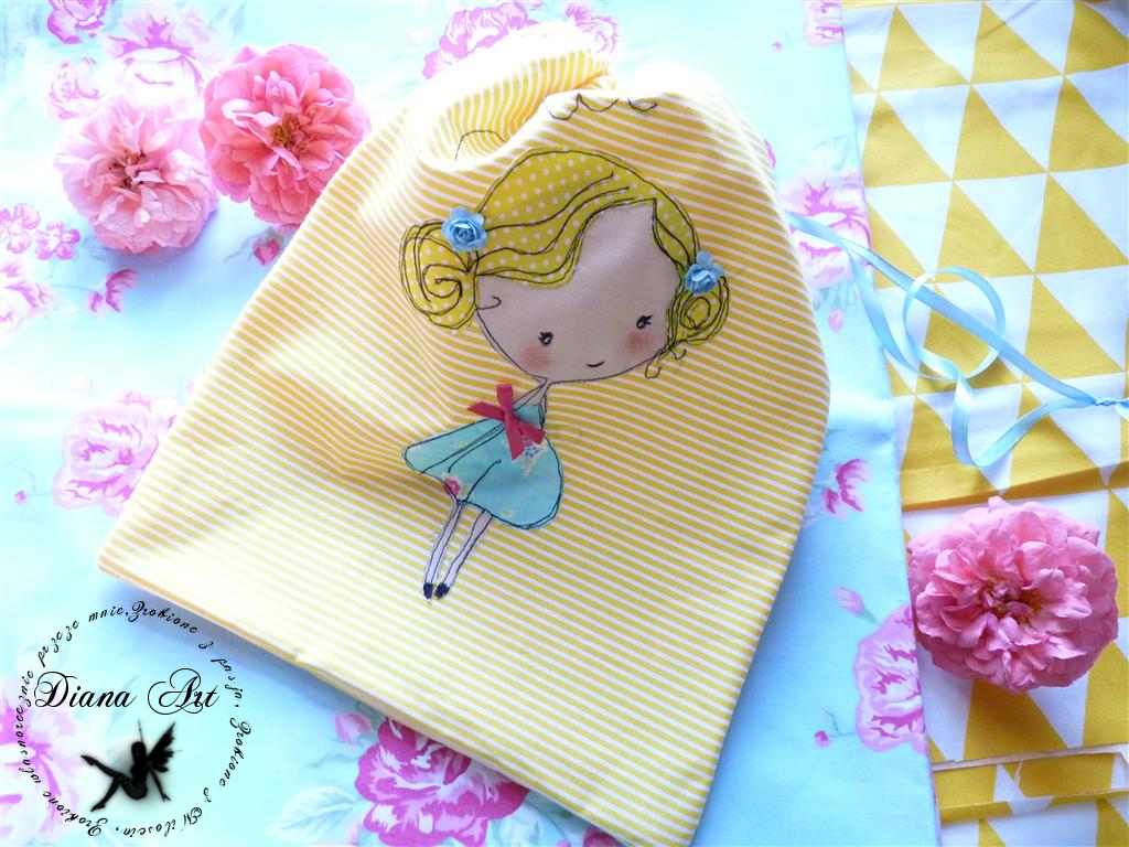 Pierwszy z nich to worek z imieniem, zaprojektowany przez dziecko miał być żółty z niebieską tasiemką i lalką :)